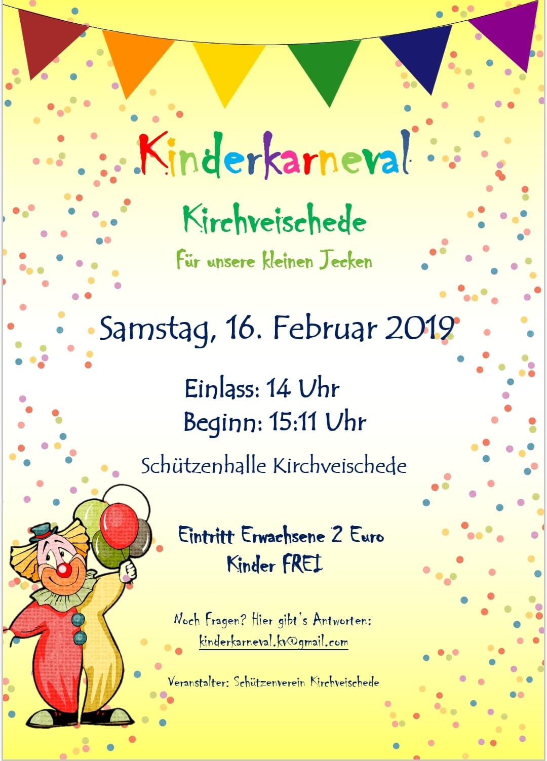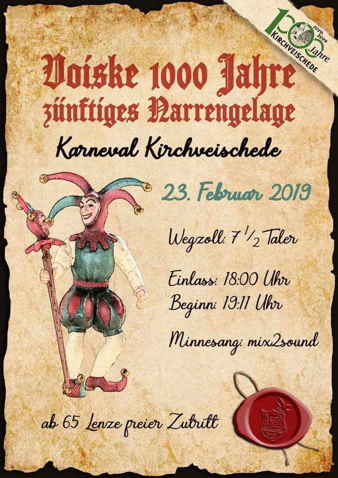 Am 23.02.2019 feiert Kirchveischede wieder Karneval. Einlass ist ab 18:00 Uhr. Los geht’s um 19:30 Uhr. Der Eintritt beträgt 7,50€. (Gäste über 65 Jahre sind frei)